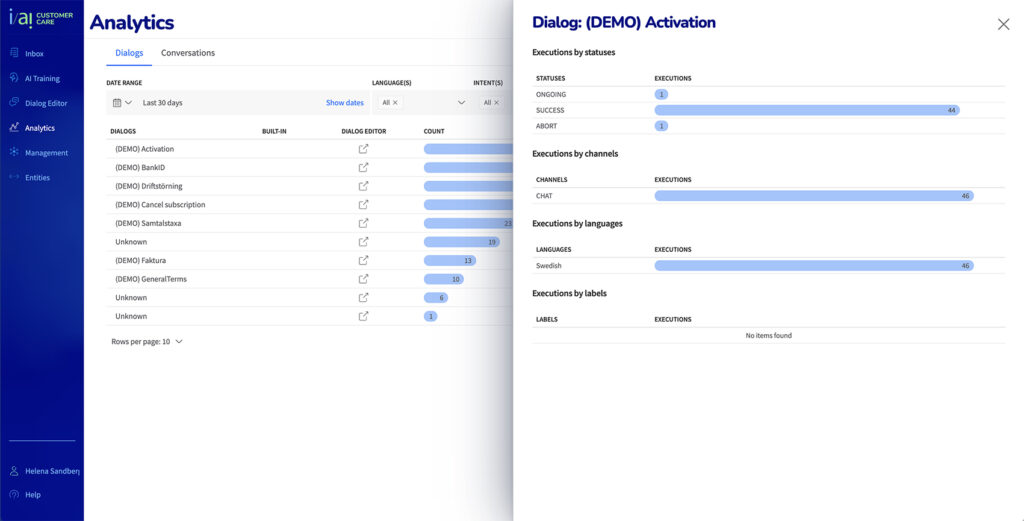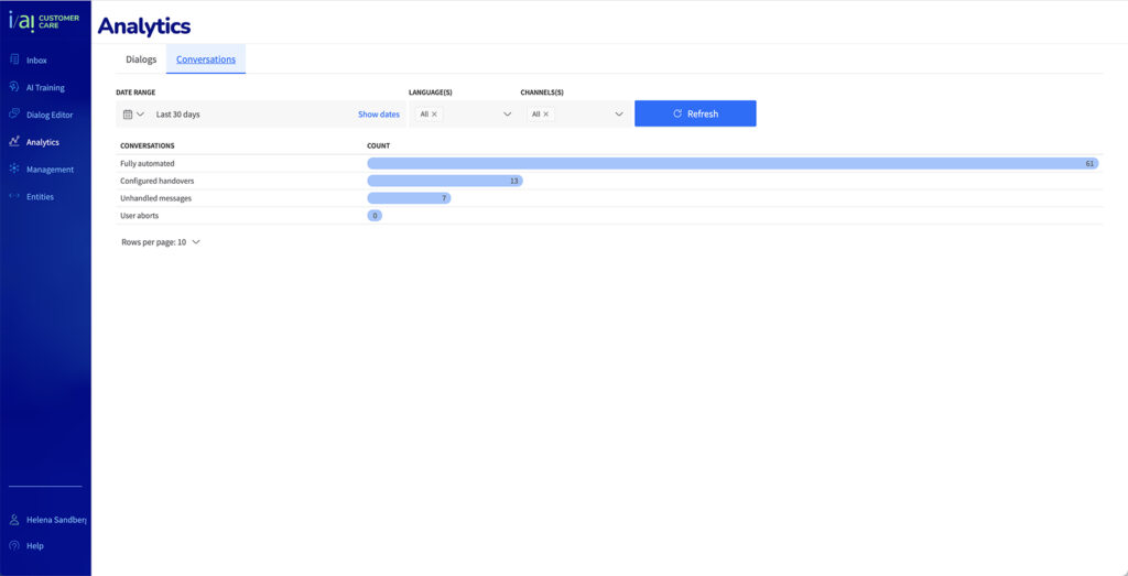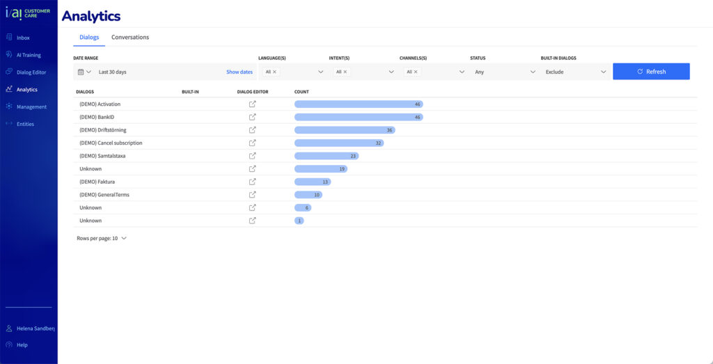 The start page show Dialogs. One dialog is one question. A customer could stay and ask several questions, then it’s a conversation, which is the second tab.